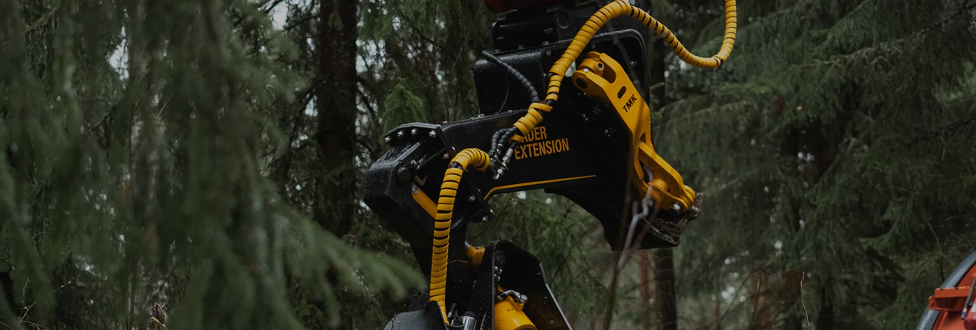 The Loader Extension & tilt is very efficient when used with a tilt rotator as you don’t have to use the excavators cylinders as much. With a tilt rotator you can make tree stacks on the sides of the excavator as you can rotate the extension to the side and drop the trees with a tilt. The tilt also makes it possible to delimb and cut trees even higher than before as it gives you more effective reach.
